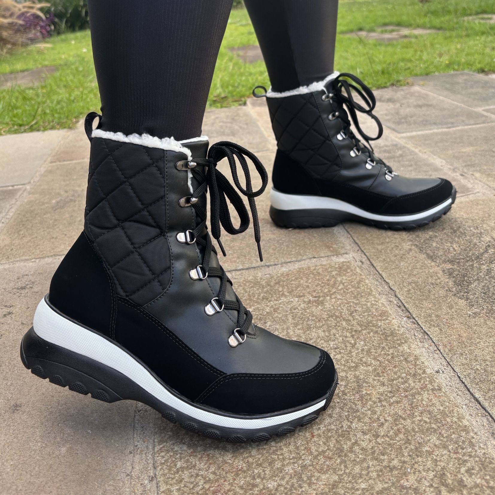 Conforto: Totalmente forrada internamente, proporciona excelente isolamento térmico. O solado anabela garante estabilidade e conforto ao caminhar, enquanto o cadarço permite ajuste firme e personalizado.